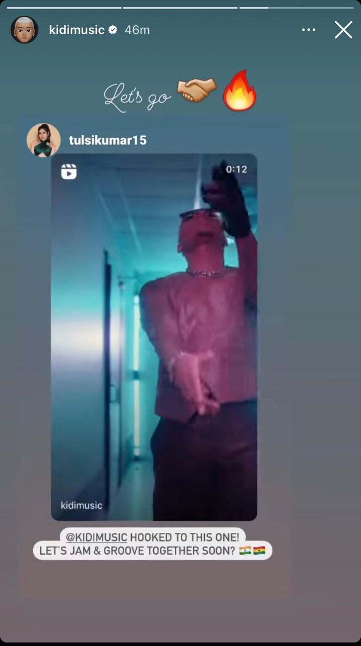 That’s not all, Tulsi Kumar later took KiDi’s track ‘Champagne’ on her Instagram story by saying “Hooked to this one! Let’s jam and groove together soon?” to which he replied “let’s go”