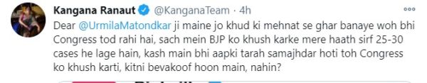 Yesterday, reacting to the reports of Urmila buying a new office in Mumbai, Kangana taking a dig at her tweeted, “Dear @UrmilaMatondkar ji maine jo khud ki mehnat se ghar banaye woh bhi Congress tod rahi hai, sach mein BJP ko khush karke mere haath sirf 25-30 cases he lage hain, kash main bhi aapki tarah samajhdar hoti toh Congress ko khush karti, kitni bevakoof hoon main, nahin?”