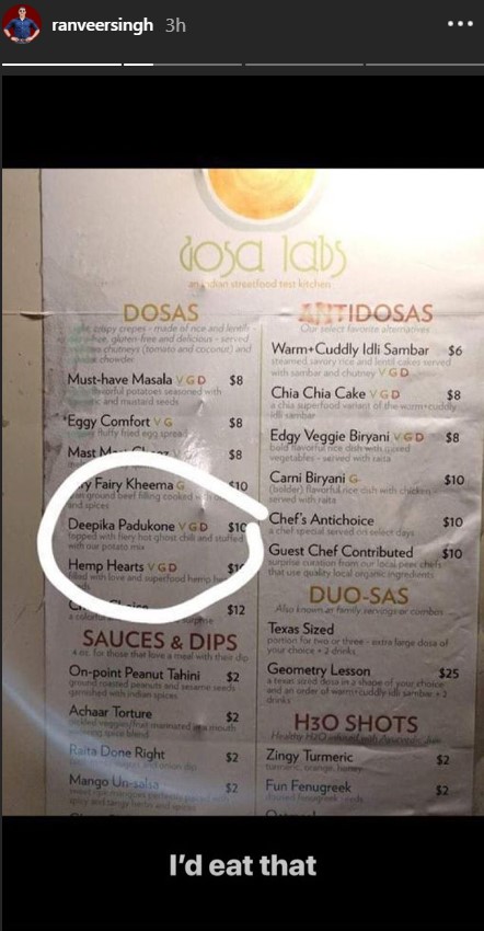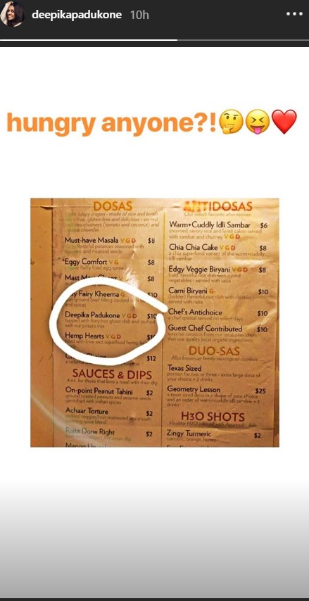 Deepika shared a picture of the menu card on her Insta stories and gave it a funny caption too. You can check out her post below: