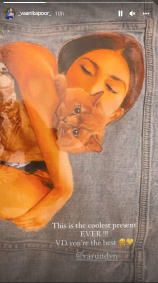 Vaani Kapoor has shared a picture of the hand-painted piece of denim. The picture drawn was of a girl and cat, taking inspiration from Vaani and her beloved kitties. Along with the picture, Vaani wrote, ‘This is the coolest present EVER! VD you’re the best @varundvn.’