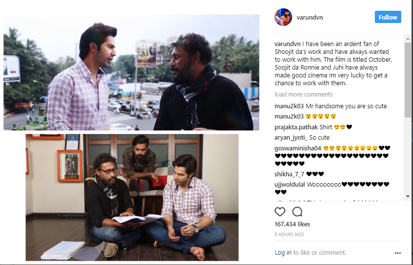 Varun Dhawan, who has created a space for himself in the world of Bollywood on the basis of his talent, seems to be directors’ new favourite. He is currently working on ‘Judwaa 2’, post which, he will begin with Shoojit Sircar’s next film. We vaguely had an idea about Varun next film with Shoojit, but had no confirmation on the same. But today, Varun took to his Instagram han to officially announce the film. Varun posted a picture of himself with Shoojit Sircar and captioned it as, “I have been an ardent fan of Shoojit da’s work and have always wanted to work with him. The film is titled October. Soojit da Ronnie and Juhi have always made good cinema Im very lucky to get a chance to work with them.” [sic]