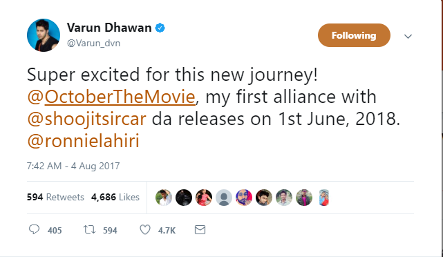 Varun had recently announced this film through social media by posting a picture of himself and the director discussing over the script of the film. Now, he took to Twitter to announce the release date of this film. ‘October’ is slated to release on June 1, 2018.
