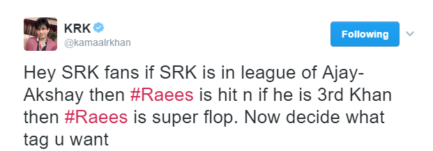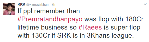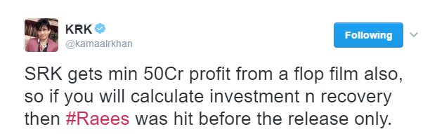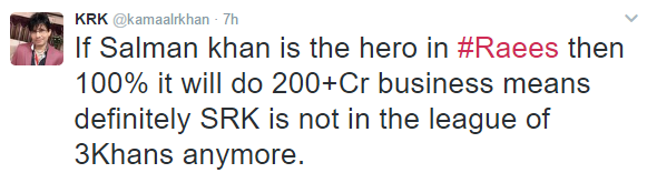 “This man calls himself a critic, but don’t be fooled by that, for he is not. He is a slander machine and gets ahead by that very same slander. If you should read the tweets and there are many more on his tweet timeline, you will see a pattern emerge. This man called KRK is not reviewing a film, he wants to systematically attack the stardom of Shah Rukh Khan. Not that it makes a difference to Shah Rukh Khan but it does, as I said to me.
