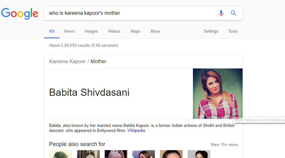 While Google gets Kareena’s mother’s name Babita Shivdasani correct, but it messes up with the image. The image that we see is of Babita aka Munmun Dutta from ‘Tarak Mehta Ka Ooltah Chashmah’.