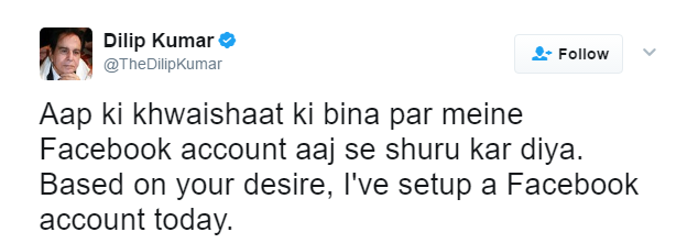 The legendary actor Dilip Kumar is finally on Facebook after incessant requests from his fans. He took to his page to share the news with a tweet that read, “Aap ki khwaishaat ki bina par meine Facebook account aaj se shuru kar diya. Based on your desire, I’ve setup a Facebook account today.” (Also Read: PICS: Dilip Kumar discharged from Lilavati Hospital, Saira Banu waves to his fans)