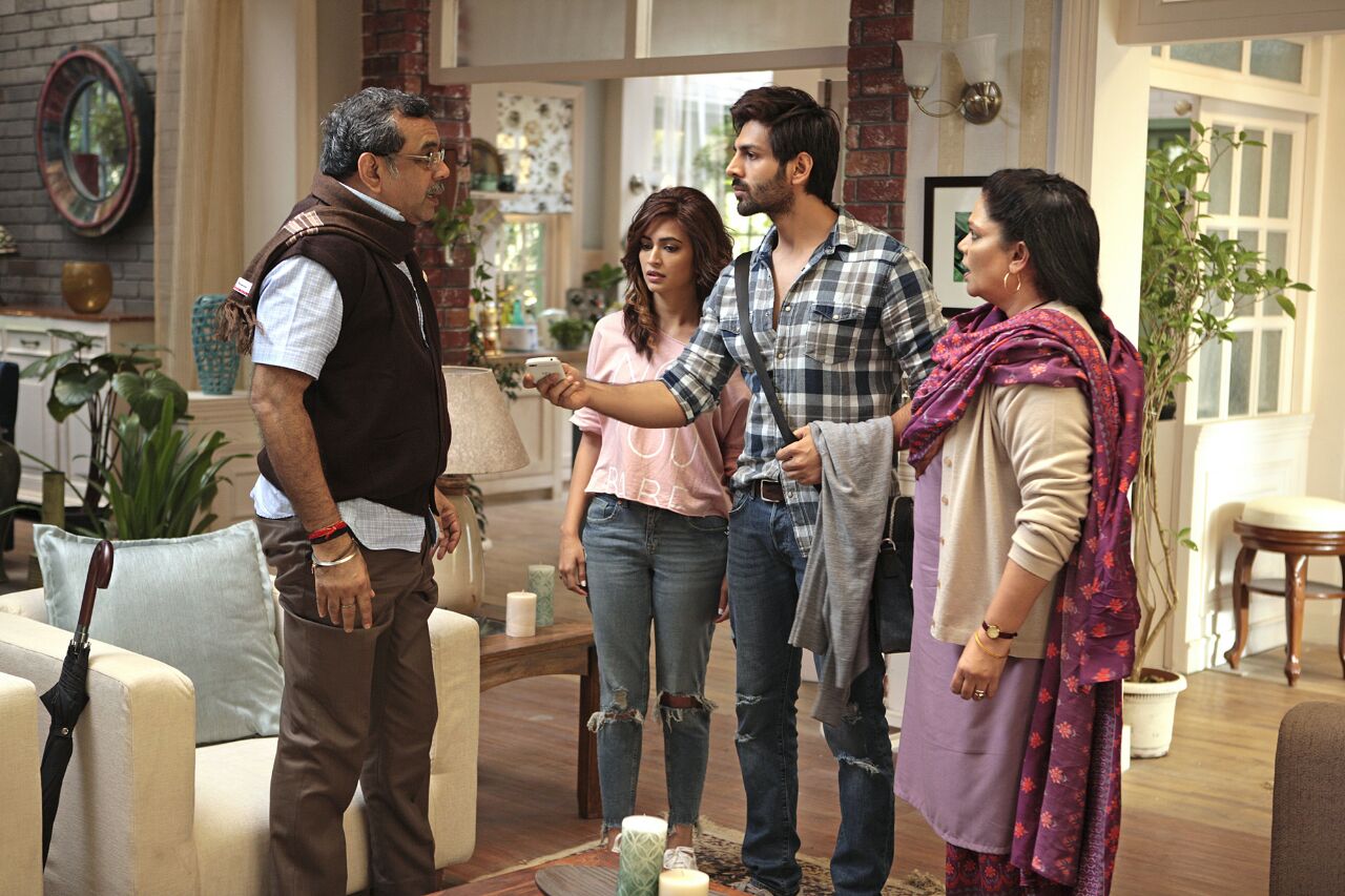 The snap hints at a tense situation inside the house where Kartik is conversing with Paresh Rawal, with a mobile in his hand. Kriti looks down while Tanvi Azmi gives an astonishing look. Trying to assume the situation, are you?