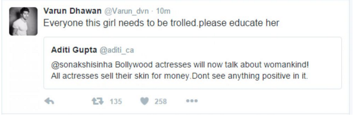 Following this, tweets and messages poured in from the various corner for Sonakshi but, a message left by Aditi Gupta was the one which attracted the attention the most. Aditi slammed Sonakshi by pointing out that actresses sell their body for money.