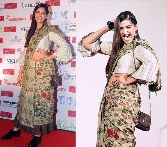 And just when we thought that Sonam has shocked us, confused us and made us go WTF, here she comes in this tricky handwoven khadi saree from Anavila Misra. And the woman clubbed it with black brogues. Yes, you heard it right. What did we learn? It’s totally cool to show your ankles while wearing a saree. We love those bell sleeves and how it was draped visibly higher, breaking all fashion norms.