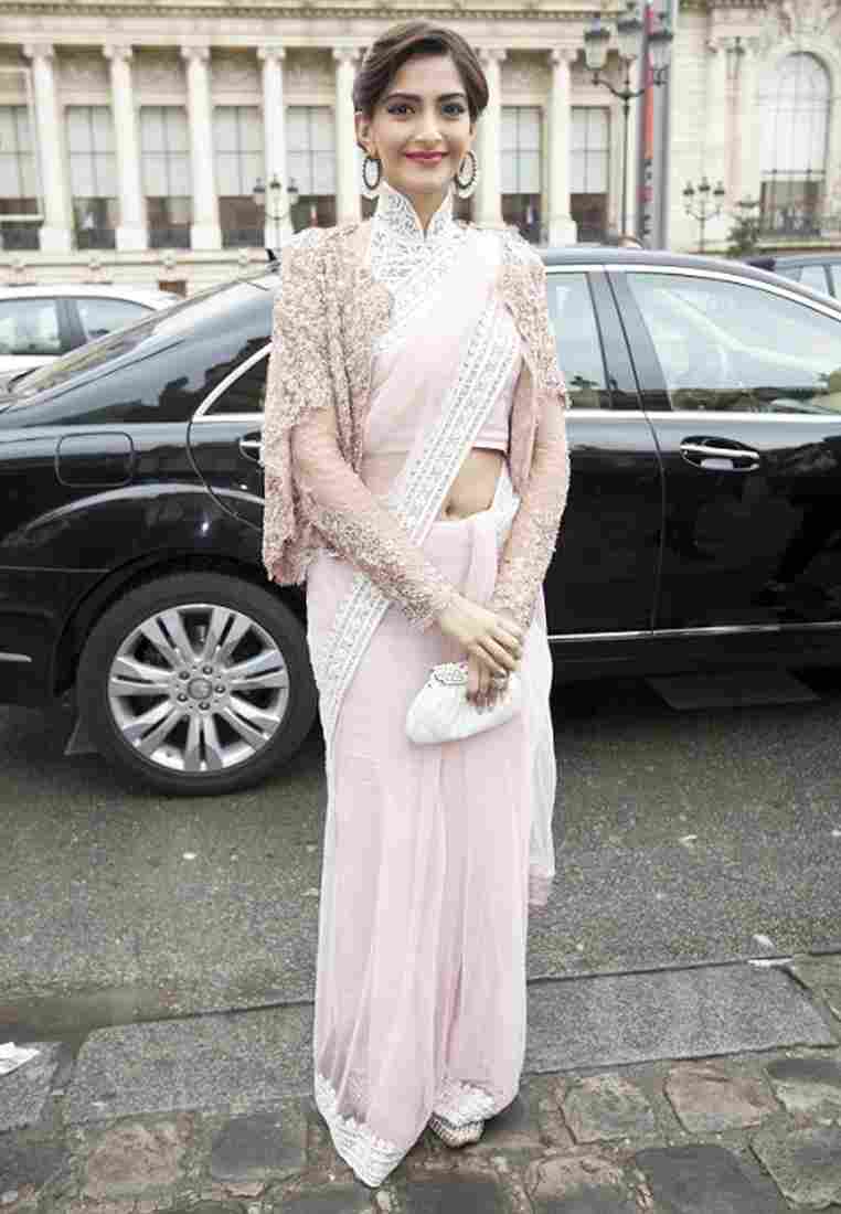 The actress attended the Elie Saab couture show during the Paris Fashion week wearing this Deepti Pruthi powder-pink net sari with an intricate white lace border. We just can’t take our eyes off the white halter blouse with lacy collar detailing and that peach Elie Saab long sleeved lace shrug. She completed the look with pearl hoop earrings and an elegant white clutch.