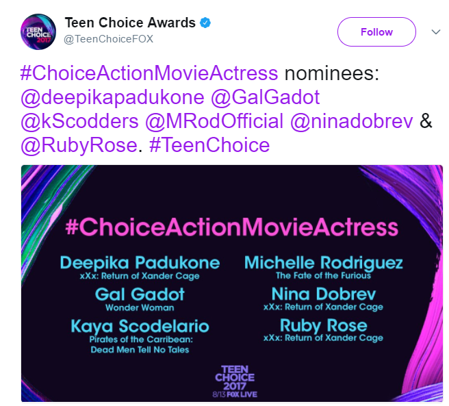 Apart from competing with the ‘Wonder Woman’ for the title, Deepika will also be competing with her ‘xXx’ co-stars Nina Dobrev and Ruby Rose. Other nominees include Kaya Scodelario for ‘Pirates of The Carribean: Dead Men Tell No Tales’ and Michelle Rodriguez for ‘The Fate of The Furious’.