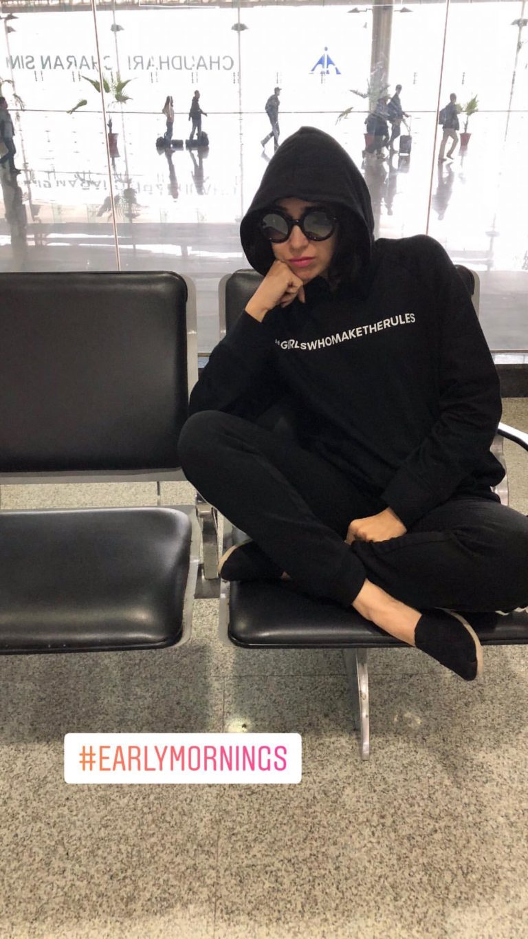 Not just that, while returning to Mumbai, Karisma Kapoor shared something more on her Instagram my-story section where she is seen wearing a hoodie from Rheson. See below: *isn’t she spelling cool here.