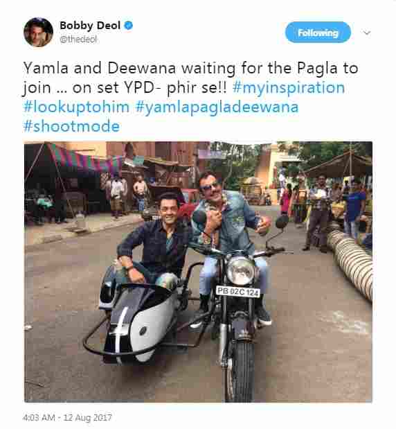 Bobby Deol took to his Twitter handle to share this picture and has captioned it, “Yamla and Deewana waiting for the Pagla to join … on set YPD- phir se!! #myinspiration #lookuptohim #yamlapagladeewana #shootmode.” [sic] This picture sees him along with his father sitting on a bike with a sidecar. (Also Read: Bobby Deol learns pure Hindi for ‘Poster Boys’)