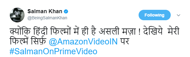 Salman Khan tweeted, “क्योंकि हिंदी फिल्मों में ही है असली मज़ा ! देखिये मेरी फिल्में सिर्फ़ @AmazonVideoIN पर #SalmanOnPrimeVideo”