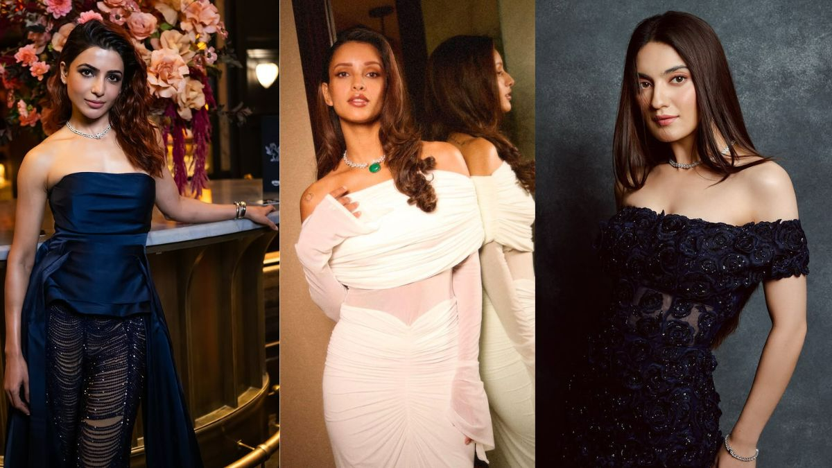 Samantha Ruth Prabhu raises the bar of pulling off a subtle coloured gown, and giving it her own twist with sparkling danglers at the bottom. The Citadel: Honey Bunny actress layers her outfit with a luxurious necklace and bracelet by Bvlgari, adding a dash of elegance to her attire.