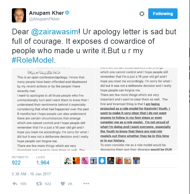 Anupam Kher says that Zaira Wasim's apology letter was full of courage.