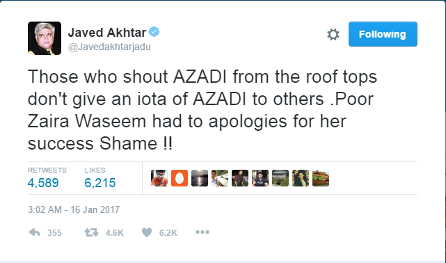 Javed Akhtar says that it is a shame that Zaira has to apologise for her success.
