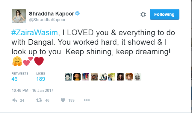 Shraddha Kapoor is appreciative of Zaira and her work.