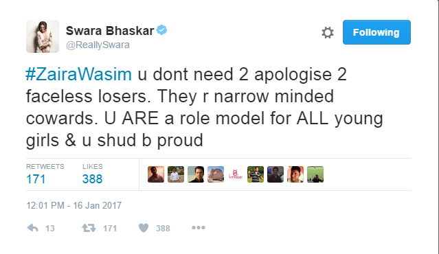 Swara Bhaskar says that Zaira Wasim does not need to apologise and she is a role model.