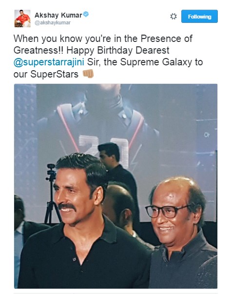 Akshay Kumar's birthday wish to Rajinikanth