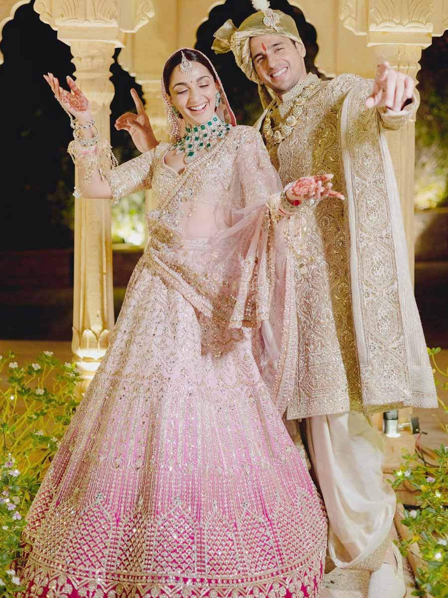 Kiara Advani:Â Kiara donned a timeless rose gold lehenga by Manish Malhotra. This outfit featured special Zardozi and Swarovski crystal embroidery, creating a look that exuded bridal charm and sophistication.