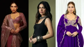 Bhumi turned heads in a royal purple anarkali set by designer Mrunalini Rao, featuring jeweled-toned richness, intricate embroidery, timeless silhouette,and a voluminous flare that gave the outfit an old-world charm. Bhumi accessorised her look with dangling golden earrings and a statement bracelet. Overall, Bhumi served a look suitable for weddings, festive parties, and traditional celebrations.