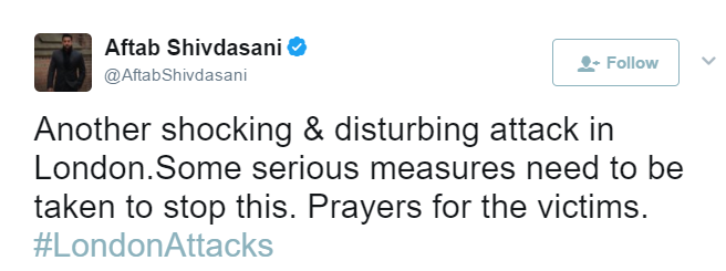 Aftab Shivdasani expressed grief over London attacks on Twitter.