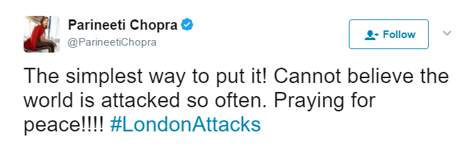 Parineeti Chopra expressed grief over London attacks on Twitter.