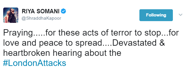 Shraddha Kapoor expressed grief over London attacks on Twitter.