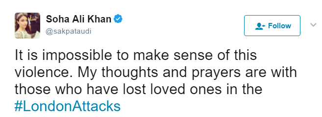 Soha Ali Khan expressed grief over London attacks on Twitter.