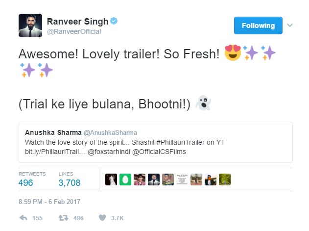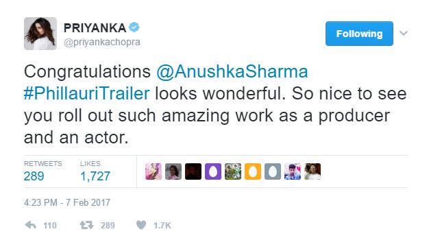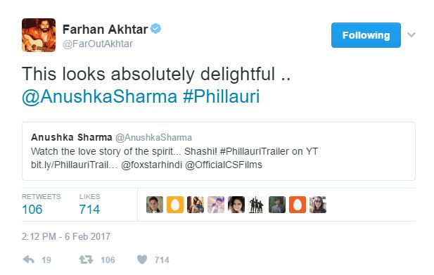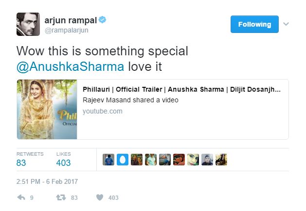 The trailer of Anushka Sharma-starrer ‘Phillauri’ was launched yesterday. The trailer is being loved by everyone, and her fans are going gaga over it. However, it’s not just her fans, but also our B-Town celebs who just can’t stop praising it. From Shah Rukh Khan to Priyanka Chopra to Farhan Akhtar, there are many celebs who are gushing about the trailer. (Also Check: Fresh and delightfully unique, trailer of Anushka Sharma’s ‘Phillauri’ is incredible)