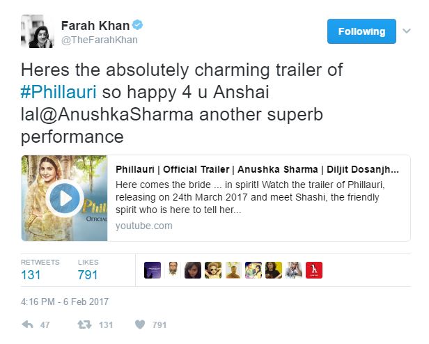 Farah Khan says the trailer of 'Phillauri' is charming.