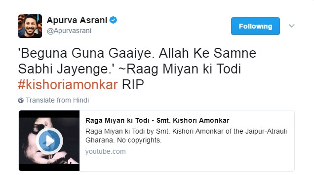 Ashutosh Gowariker offers his condolences over Kishori Amonkar's death.