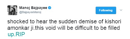 Manoj Bajpayee offers his condolences over Kishori Amonkar's death.