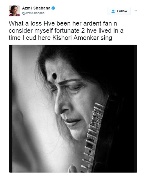 Shabana Azmi mourns Kishori Amonkar's death on Twitter.