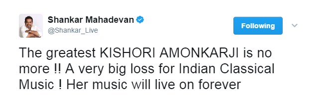 Shankar Mahadevan mourns Kishori Amonkar's death.