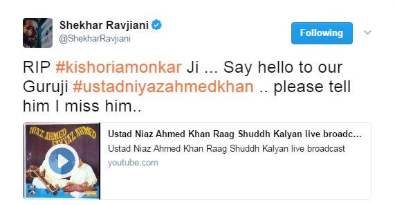 Shekhar Ravjiani mourns Kishori Amonkar's death.