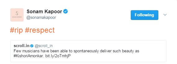 Sonam Kapoor mourns Kishori Amonkar's death.