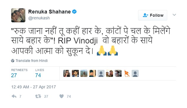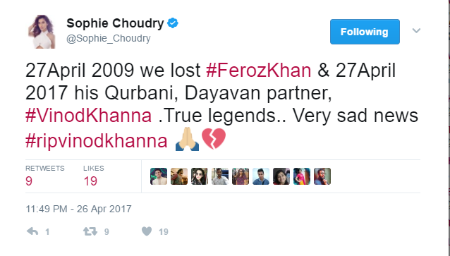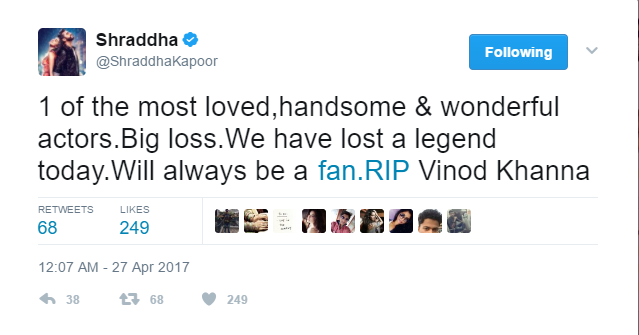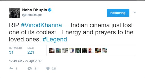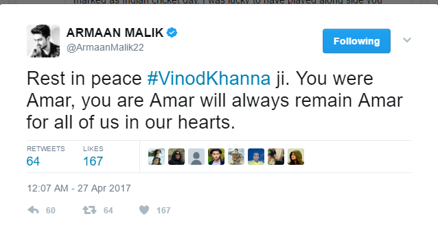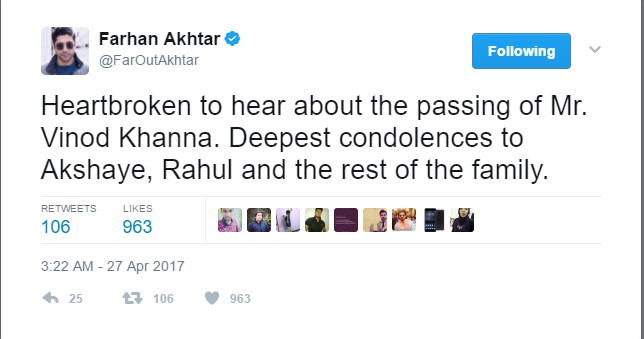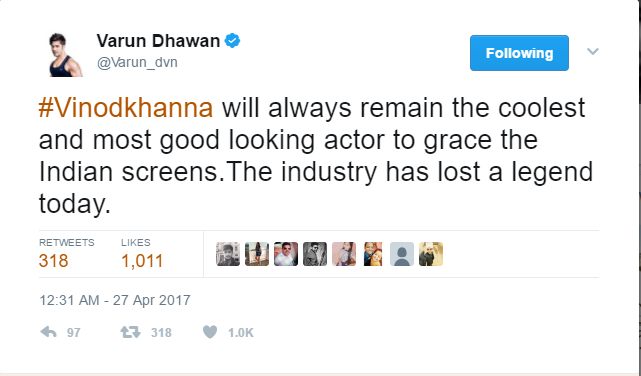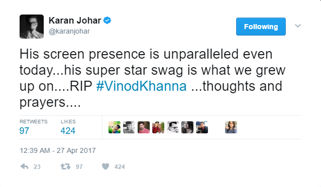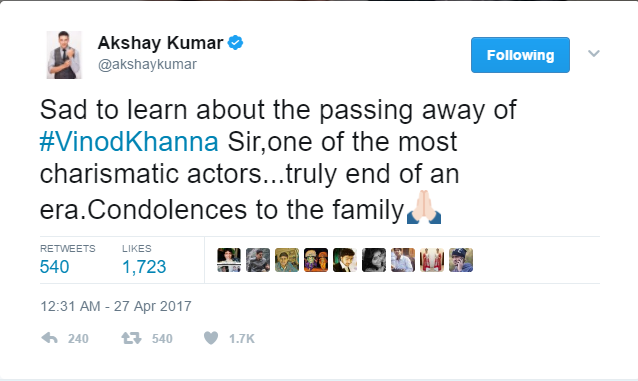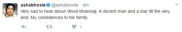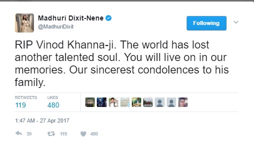 Check out the tweets of stars sharing their condolences on the death of Vinod Khanna.Â