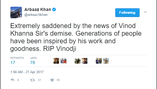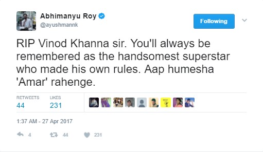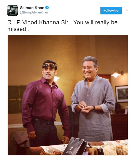 The year 2017 doesn’t seem to be extremely great for the world of Bollywood. We are not even half way through and we have already lost two iconic stars from Hindi film fraternity. Post Om Puri death, Bollywood has now lost its yet another shinning star, Vinod Khanna. The man who had a beautiful filmography in his name, breathed his last in Mumbai today. The celebrities of Indian Cinema are deeply saddened with this news and have shared their gratitude for the legend on social media. (Also Read: Actor Vinod Khanna passes away)