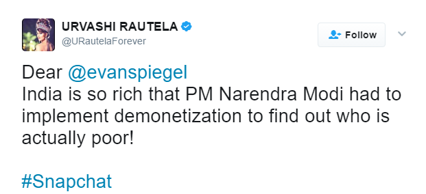 Actress Urvashi Rautela reacted to Snapchat CEO's "poor" remark on India.