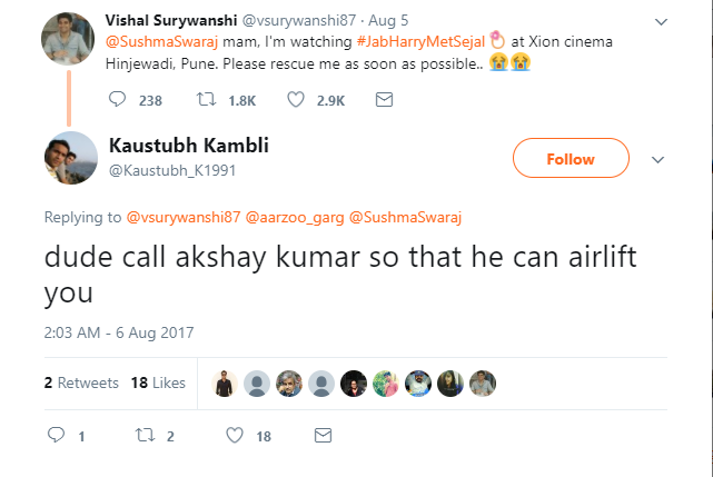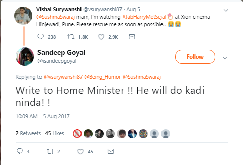 Now we know that Sushma Swaraj has time and again helped the needy. We remember how she managed to help a girl who was forcefully married to a Pakistani. And of course, the evacuation of Indians from war-torn Yemen. So this man approached Sushma Swaraj to come to his rescue while he was watching ‘Jab Harry Met Sejal’. Post this tweet, Twitter went into frenzy. Twitteratis had a ball of time adding up to the humour and generated the best reaction to this troll.