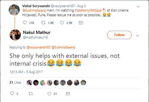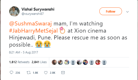 Twitter goes ROFL as someone asks Sushma Swaraj to come to his rescue while watch 'Jab Harry Met Sejal.