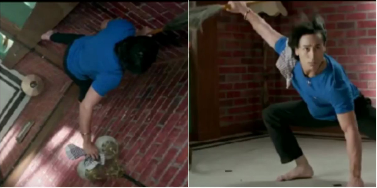 In this scene, you see Tiger Shroff cleaning the walls of his house with a broom in his left hand and immediately you see the broom in the right hand as he is down on the floor.