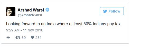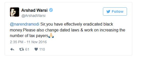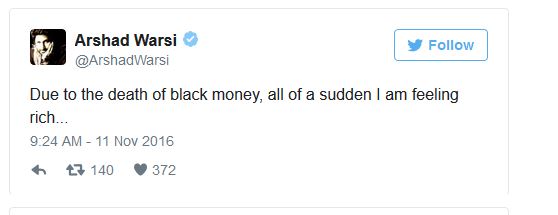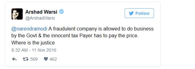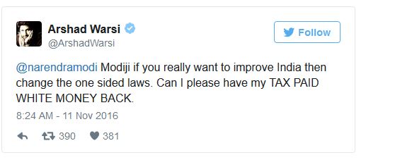 Prime Minister Narendra Modi’s decision of banning the old 500 and 100 rupees notes to curb black money and financing for terrorism is probably the most moving and bold decision in India’s economy in the recent times. While most of Bollywood has lent its support to him, actor Arshad Warsi has a different take.