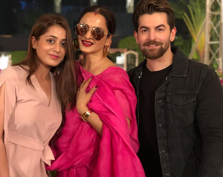 The evergreen actress Rekha poses for a picture with Neil Nitin Mukesh and his wife Rukmini.