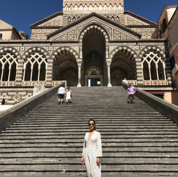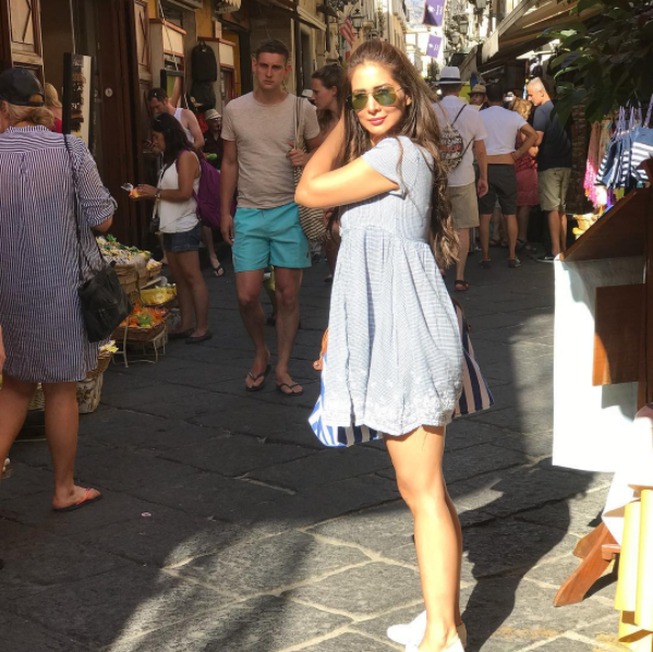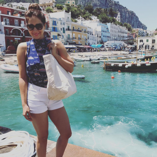 Saying hello from Capri! Kim looks damn sexy in a blue top and white hot shorts.
