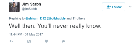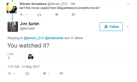 As soon as the trailer of ‘Raabta‘ made it to the internet, audience had a divided opinion to make. Quite a few people found the trailer a rip off of the South film titled ‘Magadheera’. Though the makers and the stars have been denying having any connection with the film ‘Magadheera’, people are still holding grudge against the film. We recently tweeted something about ‘Raabta’ and a Twitterati started trolling the film. ‘Neerja’ actor Jim Sarbh, who also plays a pivotal role in ‘Raabta’, could not keep his calm and gave it back to the troll. He made a serious point that unless anybody has watched ‘Raabta’, how can they draw comparisons with ‘Magadheera’. We couldn’t agree with him more. (Also Read: Get a ripped physique like Sushant Singh Rajput’s from ‘Raabta’ with his diet plan)