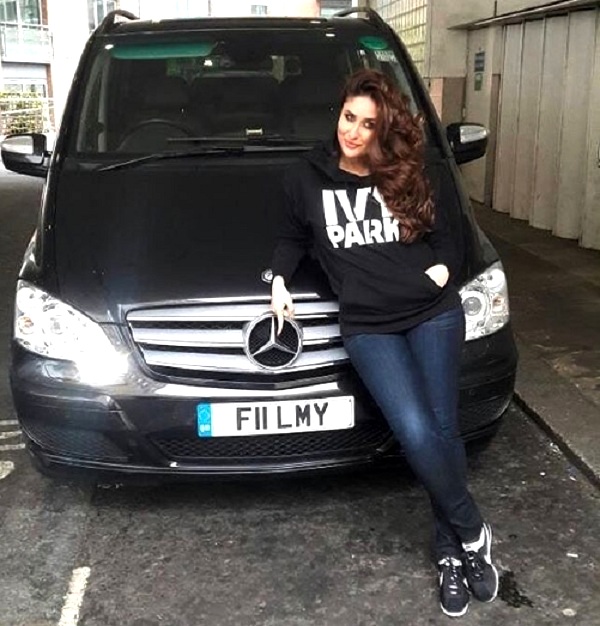 Kareena is seen wearing a black top and posing by a car. Also, notice "Filmy" written on the number plate of the car.