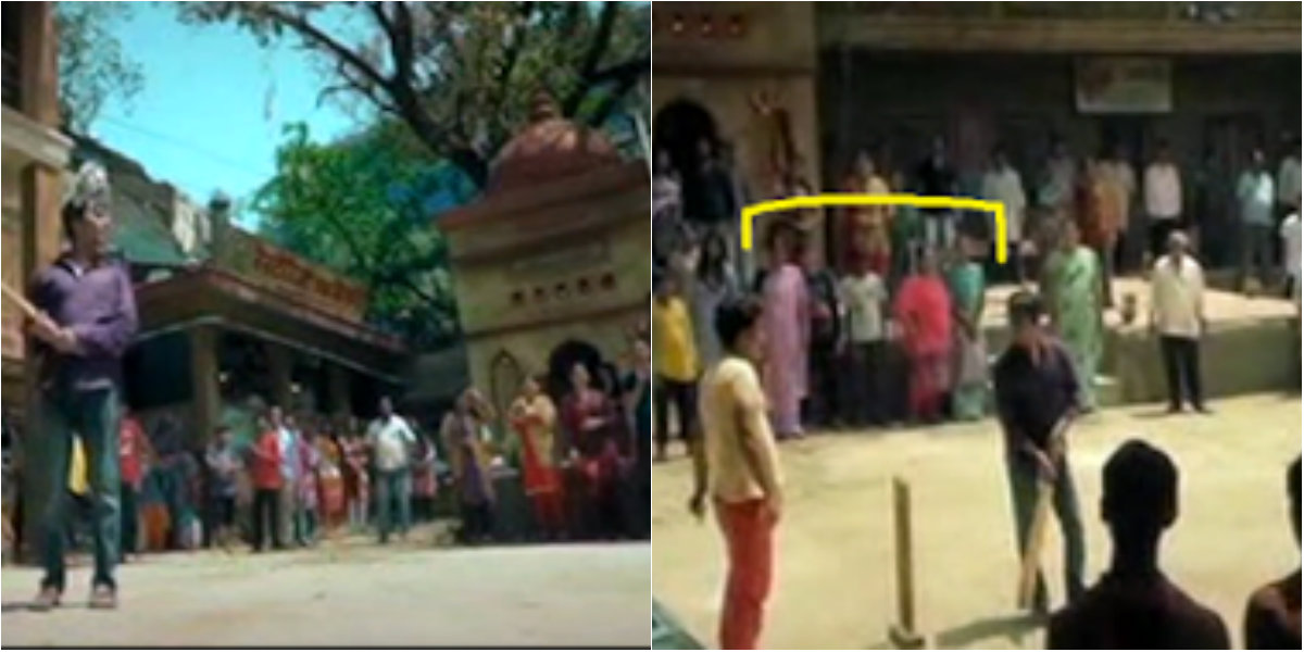Ali who is seen playing cricket outside the temple is flanked by many people amongst which you see three women and one man standing near the temple. But immediately in the next shot, you see that there are children between the two women!