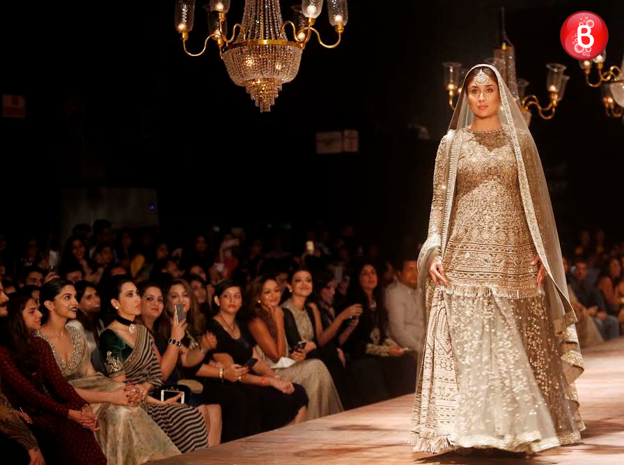 Actress Kareena Kapoor Khan provided the perfect closing act as she walked the ramp for ace designer Sabyasachi Mukerjee. She looked regal in a bridal wear attire flaunting her cute baby bump. To add to all the glory, sister Karisma Kapoor and Deepika Padukone seated right next to each other cheered on happily for the mum-to-be. It was an emotional moment for Bebo as she walked the first time for Sabya. And to gain support from sister Lolo and actress Deepika Padukone only added more charm to her face.